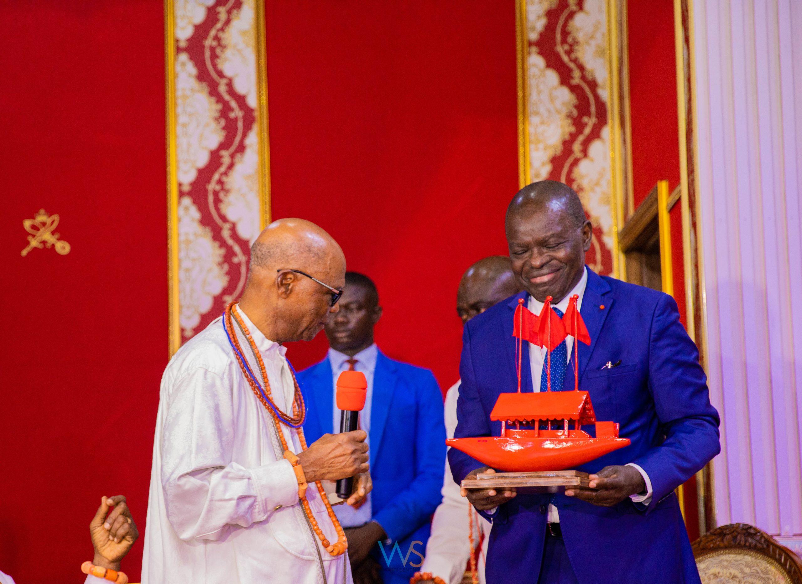 Ambassador of Côte D’Ivoire to Nigeria, Kalilou Traore at the Warri Women Townhall meeting received “The Red Boat” as a token from Ogiamẹ Atuwatse III, CFR, The Olu of Warri for visiting Warri Kingdom.