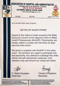 A notice issued by the State Executive Council of the Nigerian Union of Allied Health Professionals (NUAHP) directed members to comply with a proposed three-day warning strike, urging full participation while warning against any action that could undermine the directive. The union also called for unity among affected professionals as discussions continue.