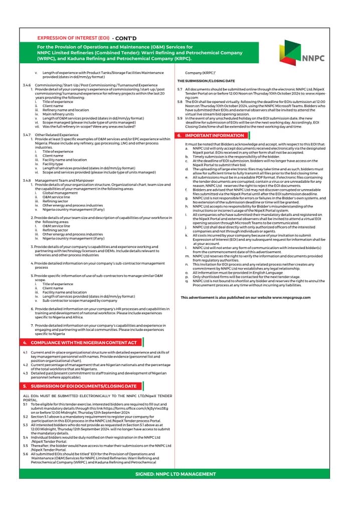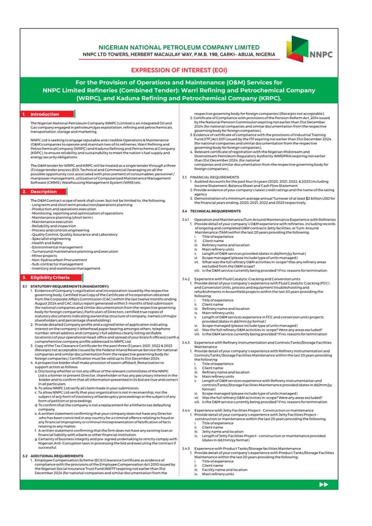 Nigeria’s National Petroleum Company has released an Expression of Interest (EOI) inviting individuals to provide Operations and Maintenance (O&M) services for the Warri Refining and Petrochemical Company (WRPC) and the Kaduna Refining and Petrochemical Company (KRPC).
