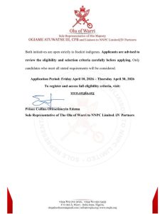 The Office of the Sole Representative of the Olu of Warri to NNPC Limited and its joint venture partners announced the launch of the Itsekiri Indigenes SME Grant Programme alongside a Skills Training Programme, both aimed at strengthening local enterprise and improving employability.
