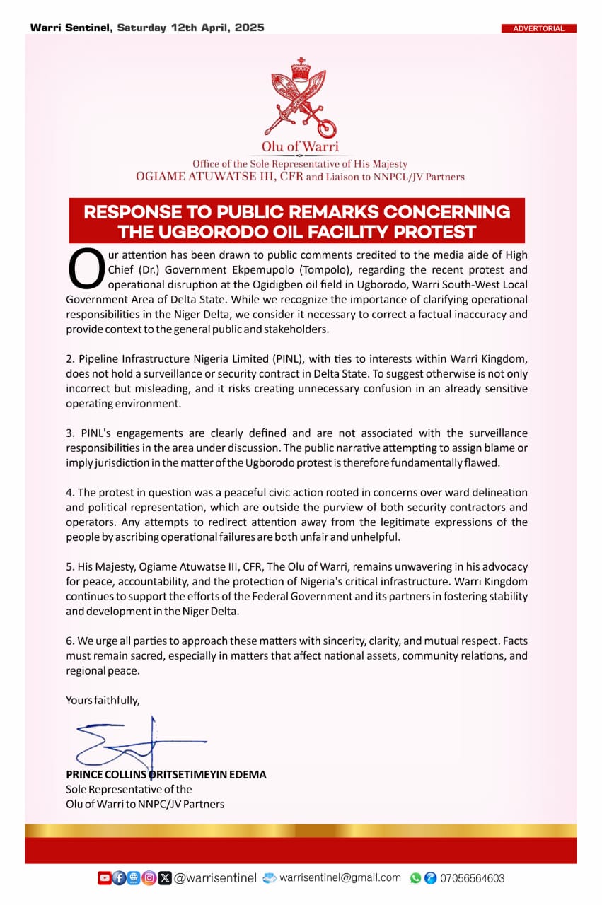 Sponsored Ad Weyinmi O April 12, 2025 0 Comments Response To Public Remarks Concerning The Ugborodo Oil Facility Protest