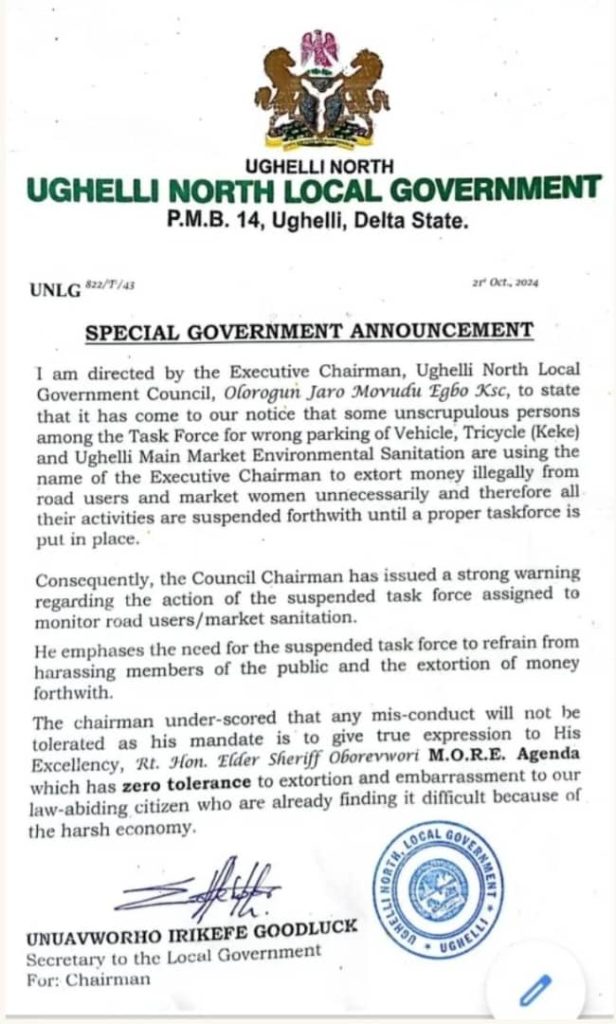 Ughelli North Council Suspends Taskforce Over Extortion Allegations